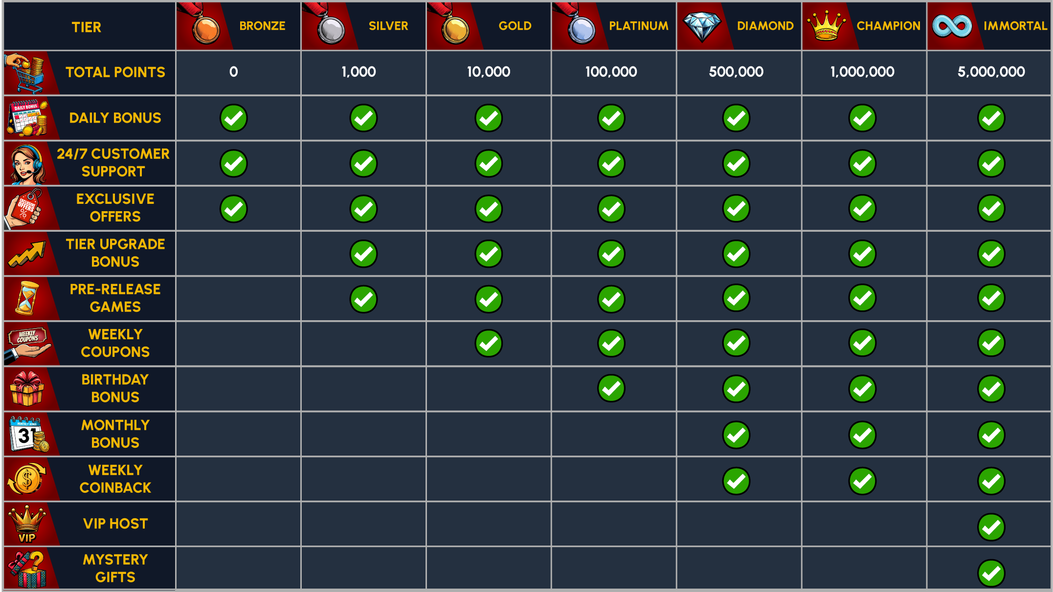 The more you engage, the more we give back! Climb through the VIP tiers and experience premium treatment with bigger bonuses, special gifts, and top-tier customer support.ย